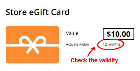 As an example, after selecting the eGift Card shown below, you would have 12 months to activate it before it expired, not the original 3 years of the Flexi eGift Card. For this reason it is very important to pay attention to the expiry and validity periods shown.
